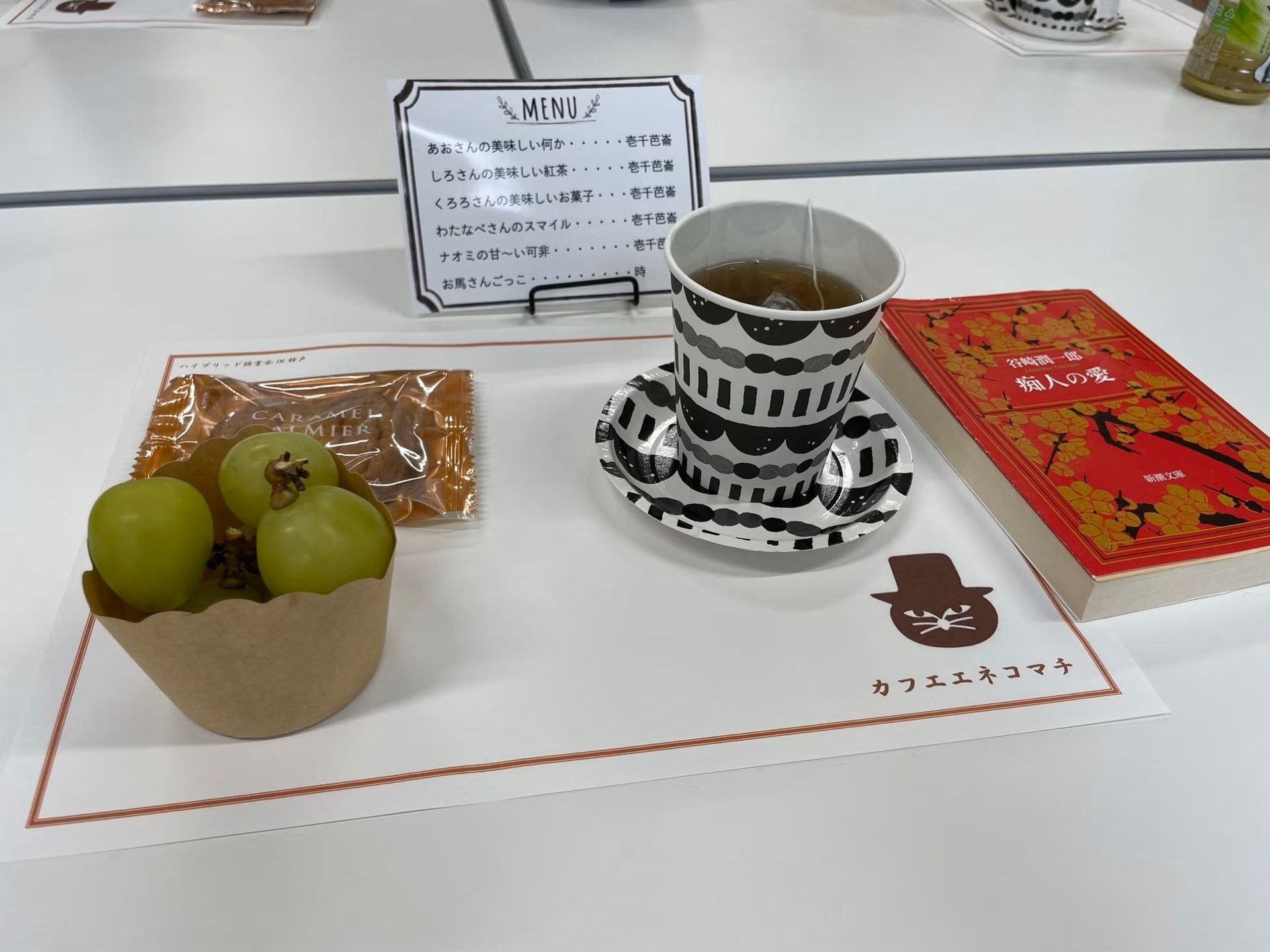 毎回工夫があり、楽しませてくれる神戸三宮会場は王道路線の「カフェ」。テーブルマットにご注目。「カフエネコマチ」とありますね。自家製ですよ。当然「MENU」も。「ナオミの甘い可非」ってどんな味がするのでしょうか。