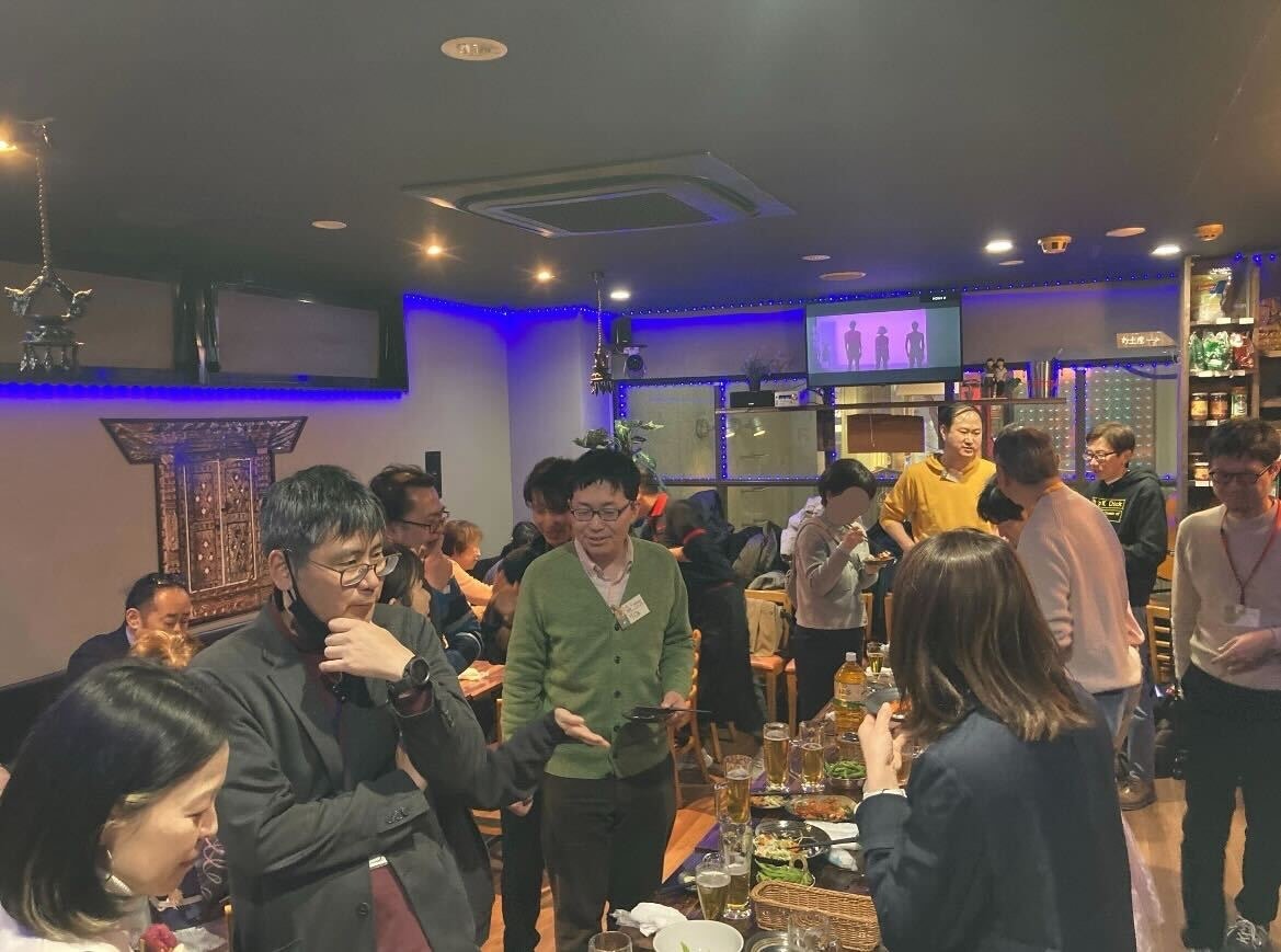 読書会終了後、藤が丘駅近くの懇親会会場へ移動。懇親会会場はネパール料理のお店で半立食形式で行いました。スケザネさんも途中まで参加していただき、参加者の方といろいろな話で盛り上がっていました。