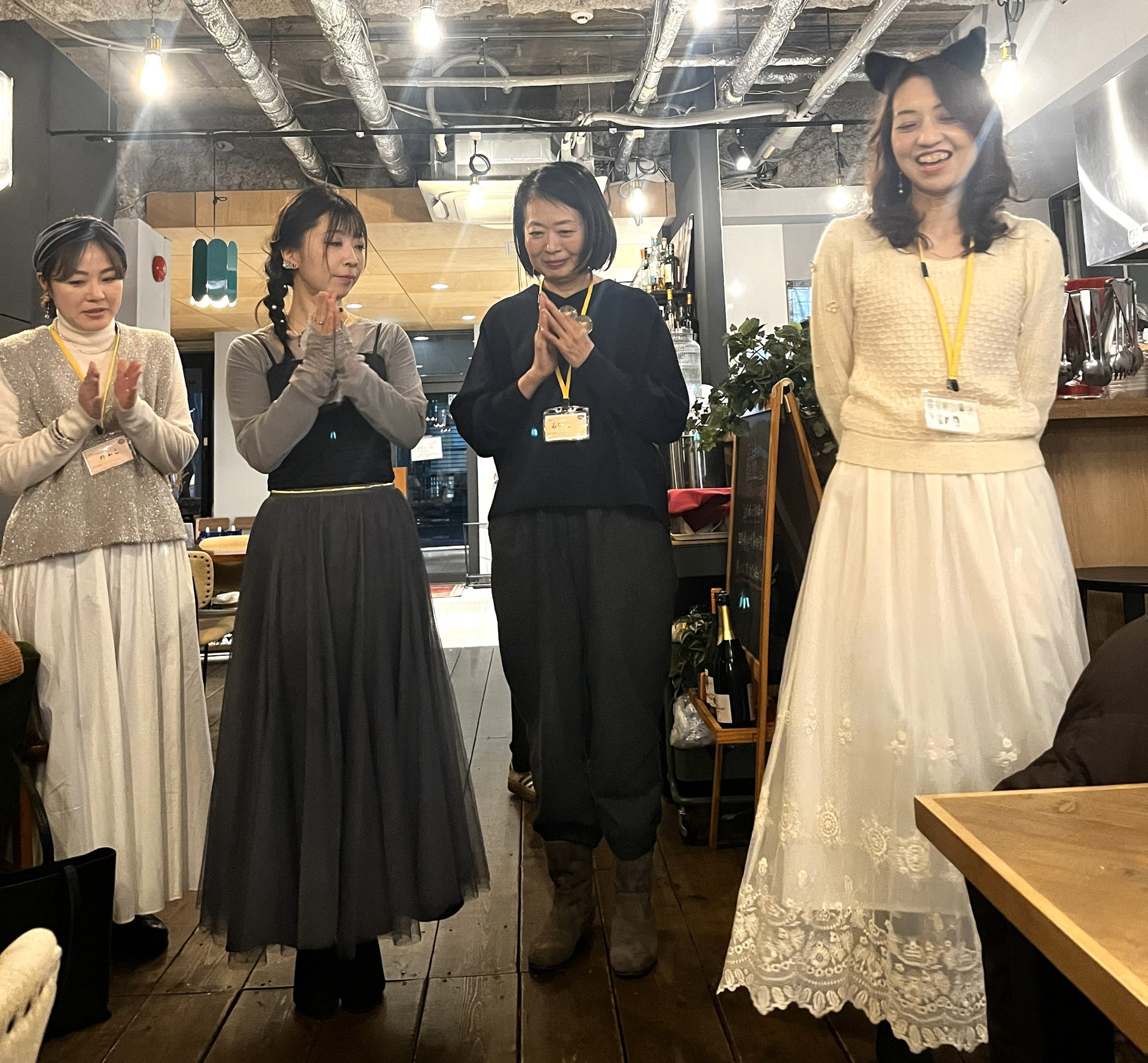 読書会後には、遊びの要素のドレスコード「雪」に対しての各テーブルで選んだベストドレッサーの発表です。服で表現したり、持ち物で表現したり、それぞれの個性が出ています。