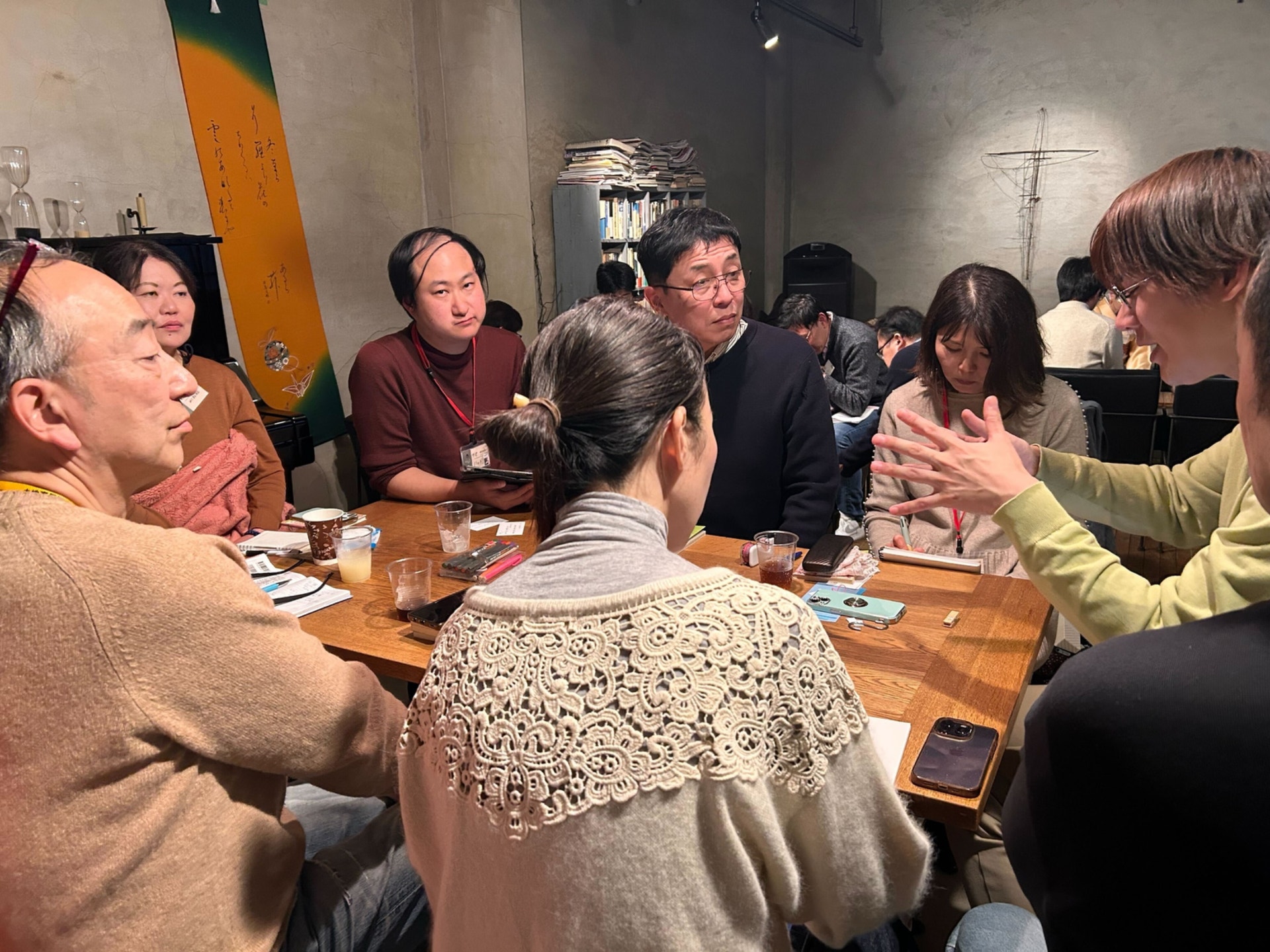 読書会中、スケザネさんは各テーブルを回り、参加者の質問に答えてくれました。身近でお話しすると、さらに熱のこもった話しぶりで聞き入ってしまいます。