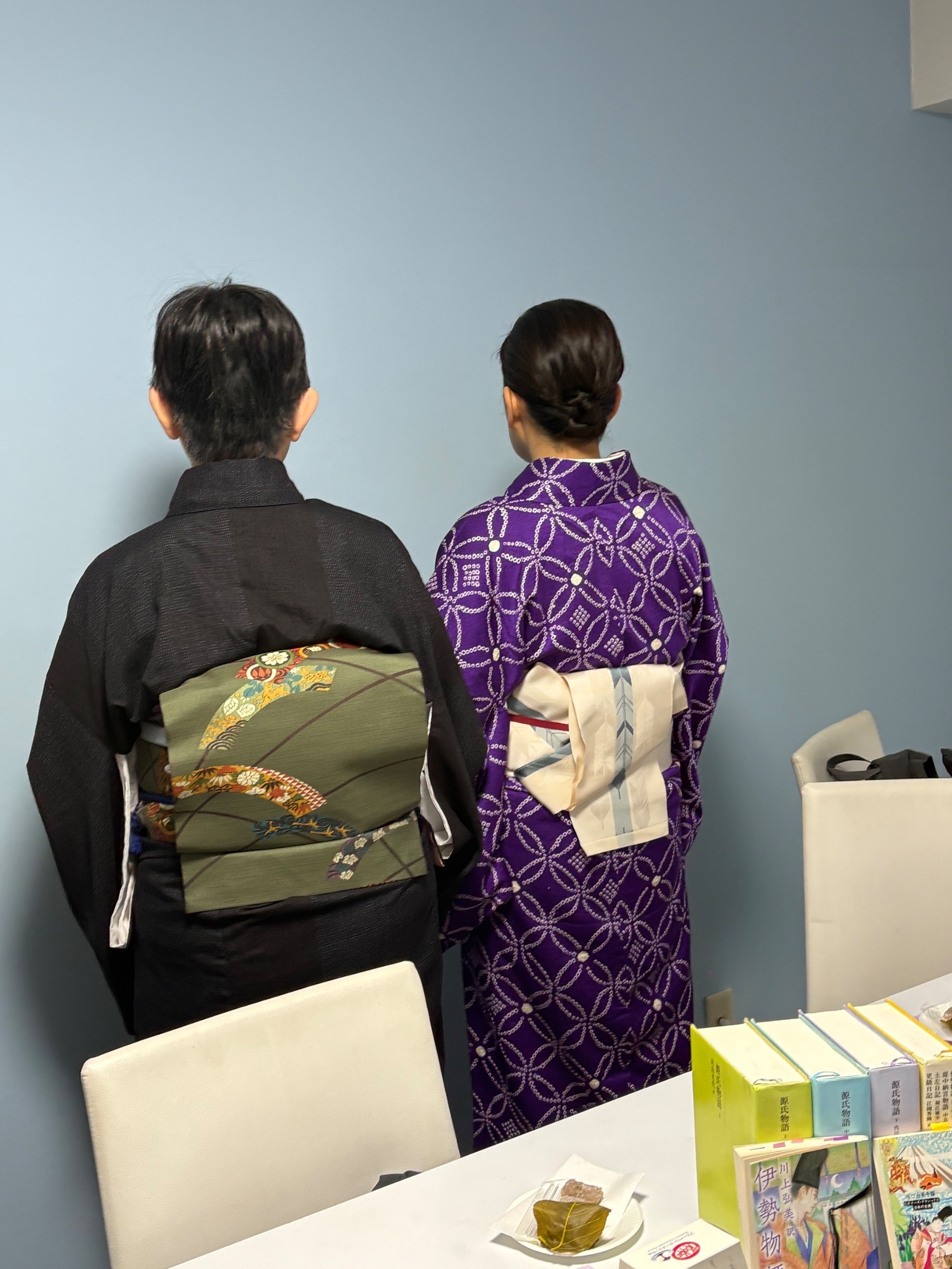 お着物写真のはしっこに写っている『源氏物語』が見えますか?こちらのお話とも比べながら大いに盛り上がったそうです。