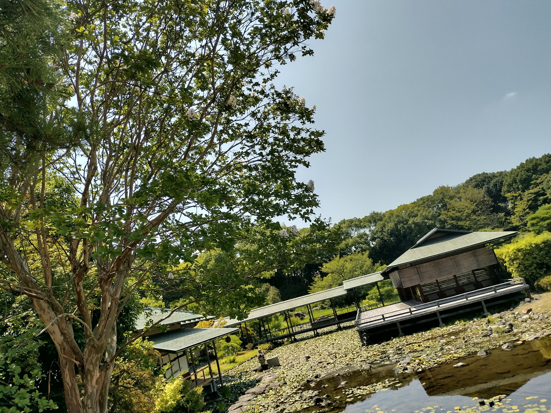 古風な日本家屋のまわりを、庭園と睡蓮の池で囲んでいます。