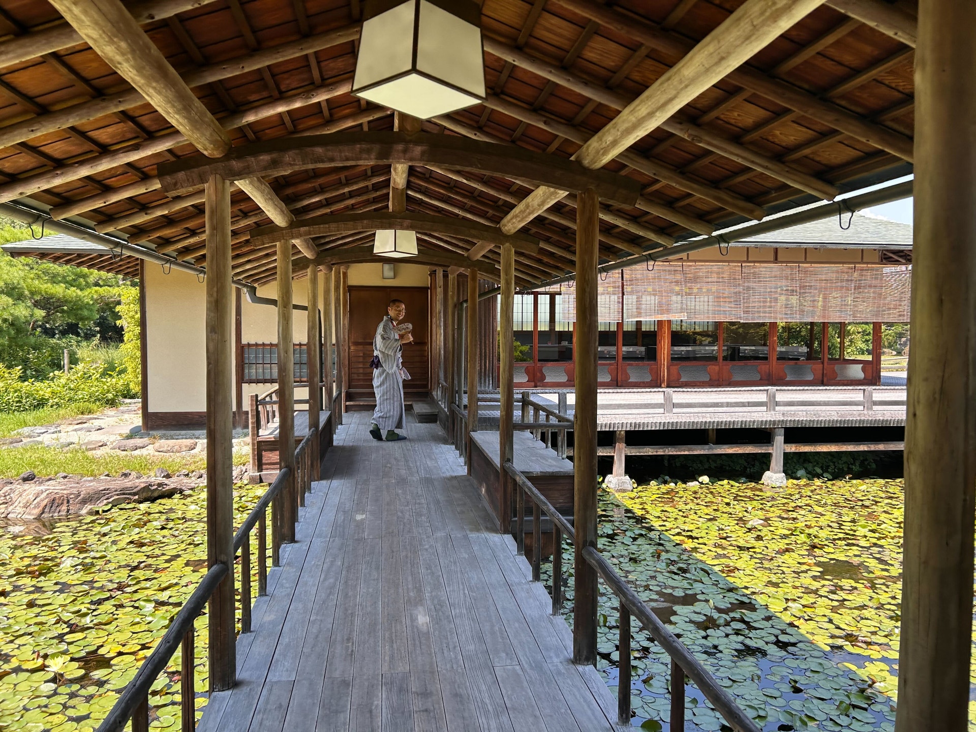 立礼式茶室に向かう渡り廊下は、睡蓮の池に囲まれた撮影のベストスポット。