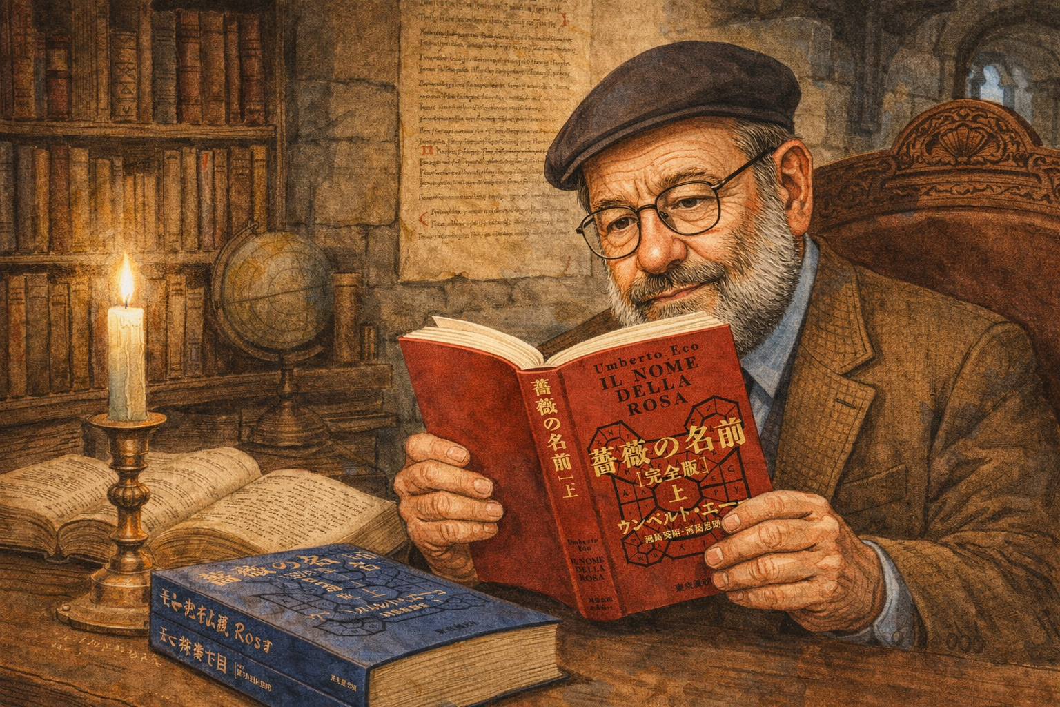 『薔薇の名前』(原題:Il nome della rosa/1980)はウンベルト・エーコUmberto Ecoの小説第一作です。刊行されるやいなや、イタリア読書界の話題をさらい、あっという間にベストセラーとなり、世界各国で訳出されました。1986年にはジャン=ジャック・アノー監督、ショーン・コネリー主演(時代考証にジャック・ル・ゴフという著名な歴史学者も参加)で映画化され、1987年(まだ邦訳版が刊行される前でした!)に日本でも公開され、話題を呼びました。