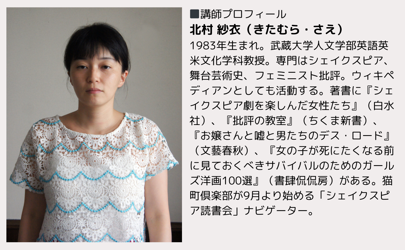 講師は『学校では教えてくれないシェイクスピア』 『シェイクスピア劇を楽しんだ女性たち』の著者であり、現代の読者にシェイクスピアの面白さを伝える第一人者、北村紗衣さん(武蔵大学准教授)。