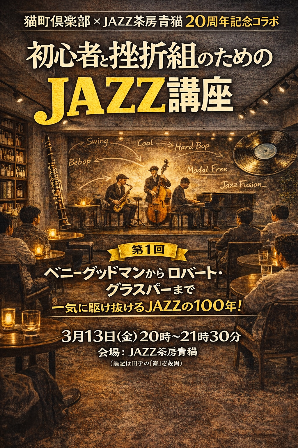 2008年5月から2011年3月までの約3年間、毎月開催していた伝説の講座「初心者と挫折組のためのJAZZ講座」。猫町倶楽部とJAZZ茶房靑猫の20周年を記念して、この講座が復刻します。